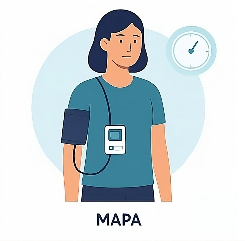 El estudio MAPA (Monitoreo Ambulatorio de Presión Arterial) es una prueba que permite medir la presión arterial del paciente de forma continua durante 24 horas, mientras realiza sus actividades diarias. Se coloca un pequeño monitor conectado a un brazalete en el brazo, que registra automáticamente la presión varias veces al día y durante la noche. Esto ayuda al médico a obtener una visión más precisa del comportamiento de la presión arterial, detectar hipertensión oculta o evaluar la eficacia del tratamiento.